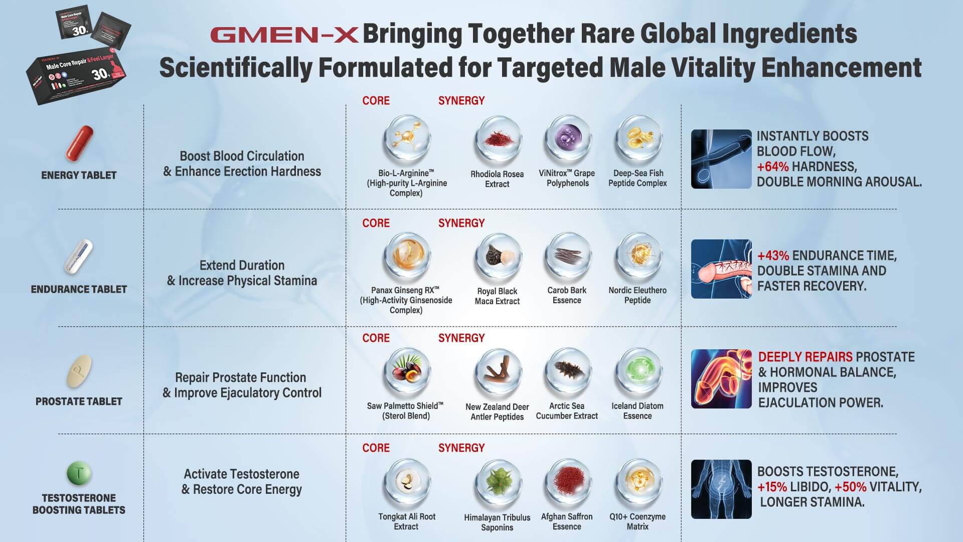 ·Saw palmetto sterol blend and Arctic sea cucumber peptides:Targeting long-term male health, this combination effectively repairs and maintains prostate function, providing a solid physical foundation for sustained and stable performance.